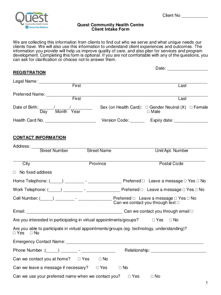 Client No ___ Quest Community Health Center Client Intake Form We are collecting this information from clients to find out whom we serve and what unique needs our clients have. We will also use this