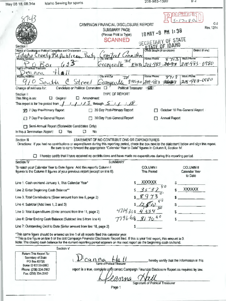 May 0818, 08 :34ap. L2089831390Idaho Sewing for sports; R;J ? O laid 171CAMPAIGN FINANCIAL DISCLOSURE REPORTSUMMARY PAGEC2 Rev. 12/148H\'18 PH :38(Please Print or Type)SCANNED c Earl\' Idaho STATEtSection