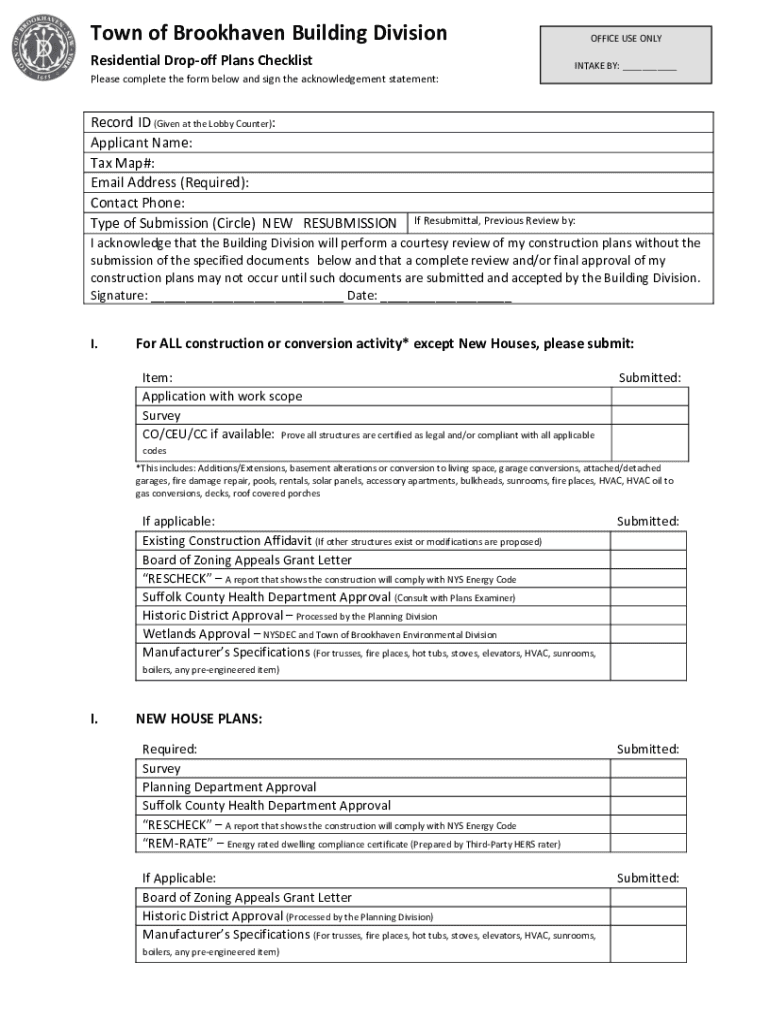 Town of Brookhaven Building Division Residential Drop-off Plans ChecklistOFFICE USE ONLY INTAKE BY: ___Please complete the form below and sign the acknowledgement statement:Record ID (Given at the