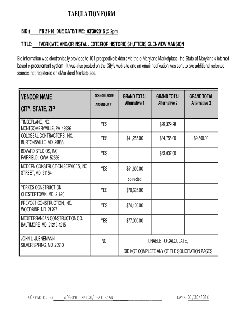 TABULATION FORM BID #IF 2116 DUE DATE/TIME: 03/30/2016 @ 2pmTITLE:FABRICATE AND/OR INSTALL EXTERIOR HISTORIC SHUTTERS GLENVIEW Mansion information was electronically provided to 101 prospective bidders