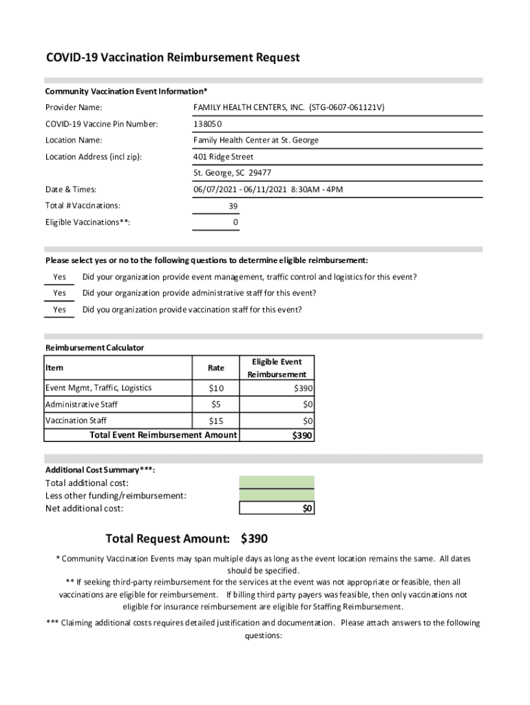 COVID-19 Vaccination Reimbursement Request Community Vaccination Event Information* Provider Name:FAMILY HEALTH CENTERS, INC. (STG0607061121V)COVID-19 Vaccine Pin:138050Location Name:Family Health