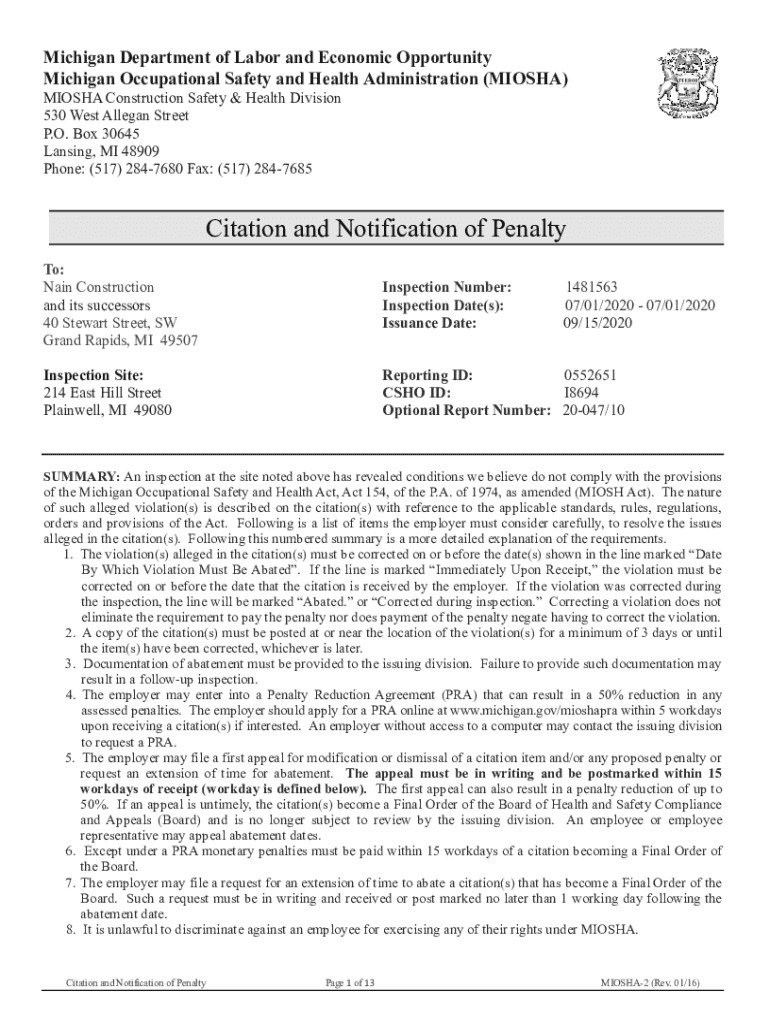 Michigan Department of Labor and Economic Opportunity Michigan Occupational Safety and Health Administration (MI OSHA) MI OSHA Construction Safety & Health Division 530 West Alleged Street P.O. Box