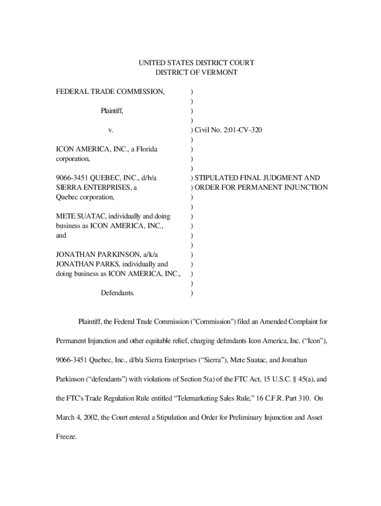UNITED STATES DISTRICT COURT DISTRICT OF VERMONT FEDERAL TRADE COMMISSION, Plaintiff, v. ICON AMERICA, INC., a Florida corporation, 90663451 QUEBEC, INC., d/b/a SIERRA ENTERPRISES, a Quebec corporation,