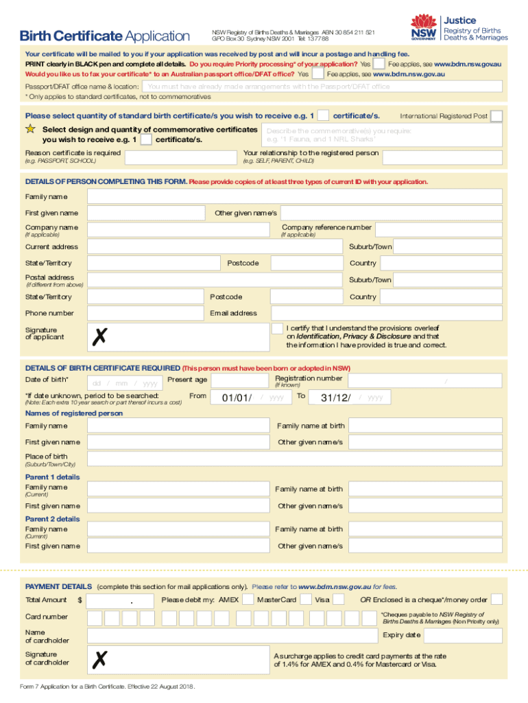 Birth Certificate Application Use this form to apply for:See website for fees and turnaround times. A standard birth certificate is an official certified copy of the registration data held by the