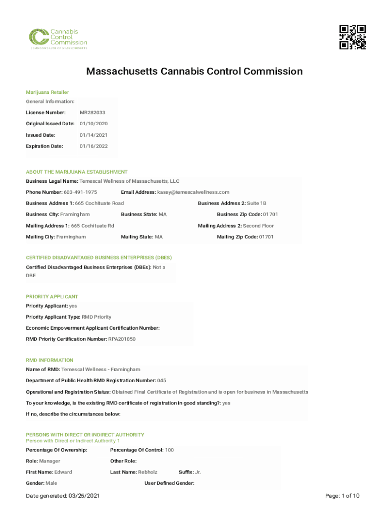 Massachusetts Cannabis Control Commission Marijuana Retailer General Information: License Number:MR282033Original Issued Date: 01/10/2020 Issued Date:01/14/2021Expiration Date:01/16/2022ABOUT THE