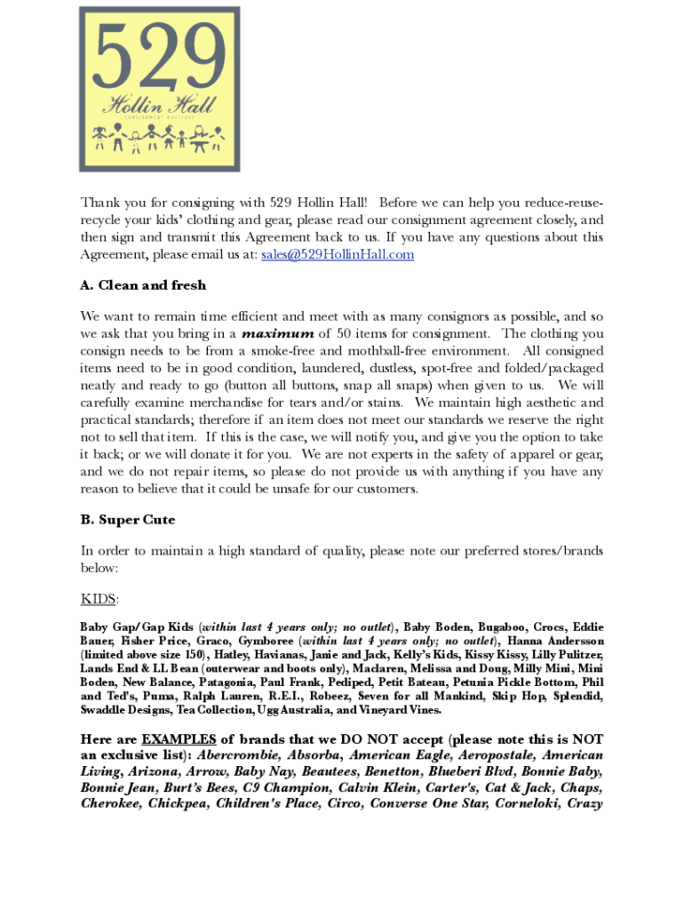 Thank you for consigning with 529 Hollis Hall! Before we can help you reducereuserecycle your kids clothing and gear, please read our consignment agreement closely, and