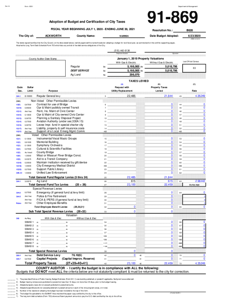 Dec18Form 635.1Department of Management191869Adoption of Budget and Certification of City Taxes FISCAL YEAR BEGINNING JULY 1, 2020, ENDING JUNE 30, 2021, The City of:County Name:ACKWORTHResolution