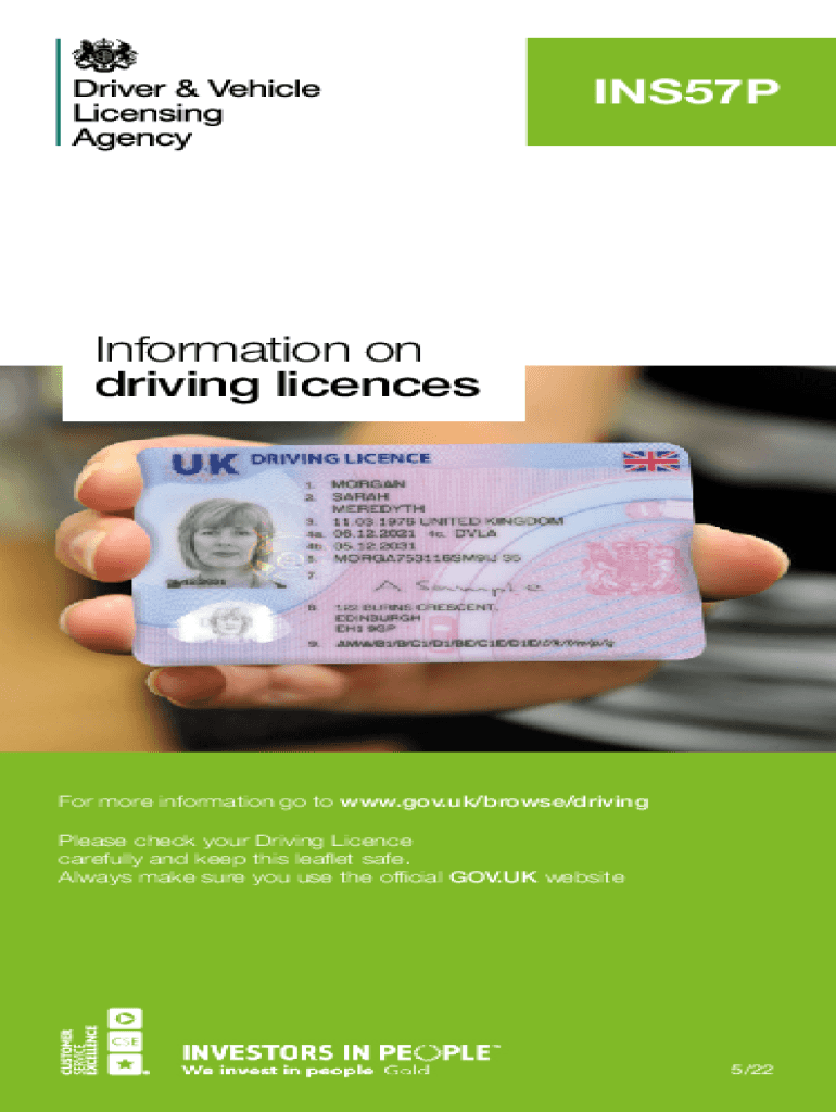 INS57PInformation on driving licensor more information go to www.gov.uk/browse/driving Please check your Driving License carefully and keep this leaflet safe. Always make sure you use the official