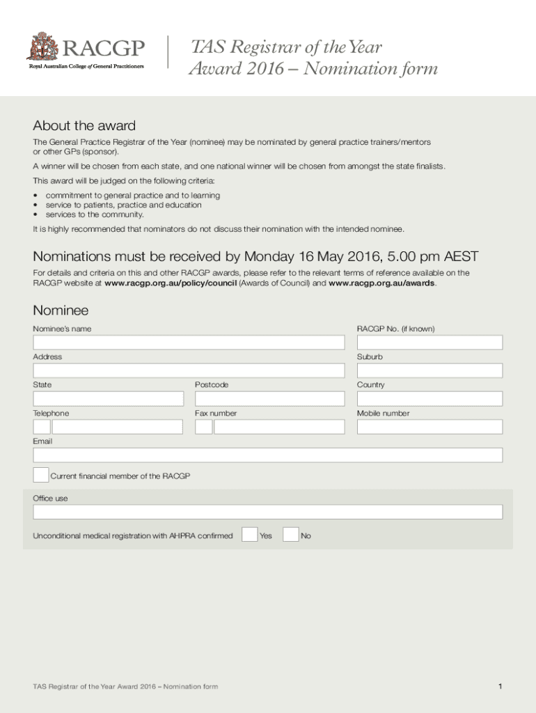 TAS Registrar of their Award 2016 Nomination form About the award The General Practice Registrar of the Year (nominee) may be nominated by general practice trainers/mentors or other GP's (sponsor).
