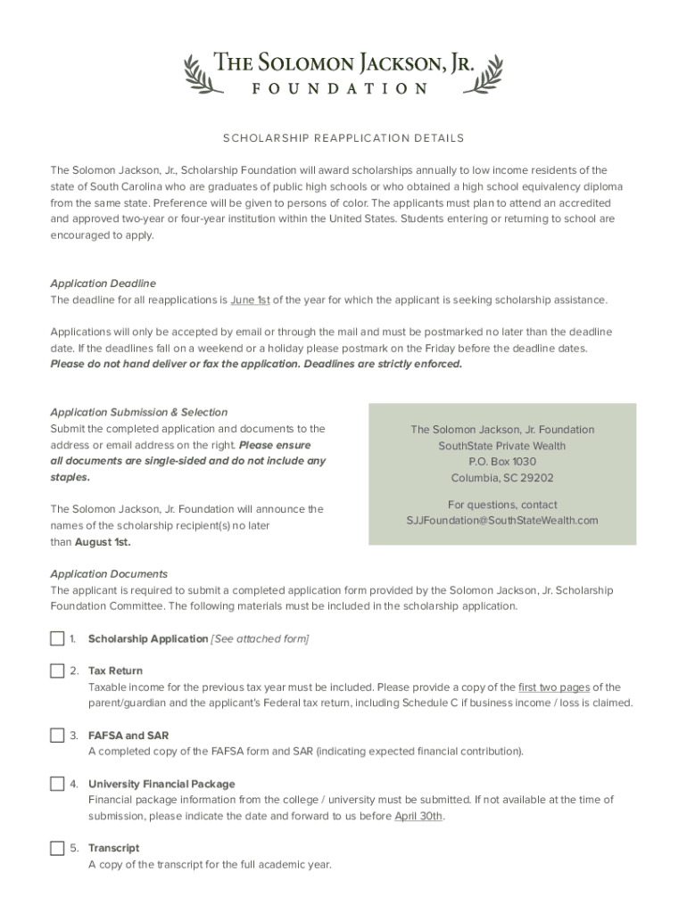 SCHOLARSHIP REAPPLICATION DETAILS The Solomon Jackson, Jr., Scholarship Foundation will award scholarships annually to low income residents of the state of South Carolina who are graduates of public