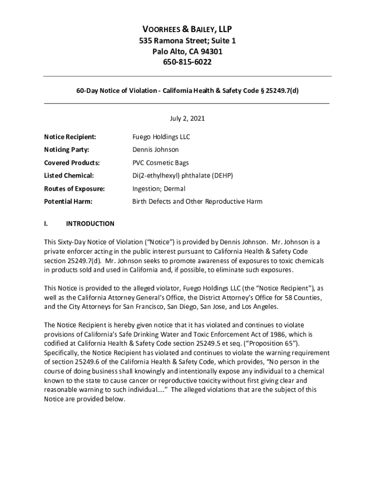 VOORHEES & BAILEY, LLP535 Ramona Street; Suite 1 Palo Alto, CA 94301 6508156022 60Day Notice of Violation California Health & Safety Code 25249.7(d) ___ July 2, 2021, Notice Recipient:Fuel Holdings