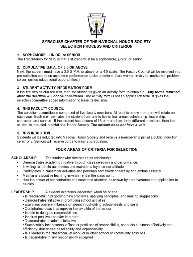 SYRACUSE CHAPTER OF THE NATIONAL HONOR SOCIETY SELECTION PROCESS AND CRITERION 1. SOPHOMORE, JUNIOR, or SENIOR The first criterion for NHS is that a student must be a sophomore, junior, or senior.