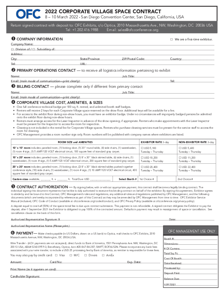 2022 CORPORATE VILLAGE SPACE CONTRACT8 10 March 2022. San Diego Convention Center, San Diego, California, USA Return signed contract with deposit to: OF Exhibits, c/o Optical, 2010 Massachusetts Ave.,