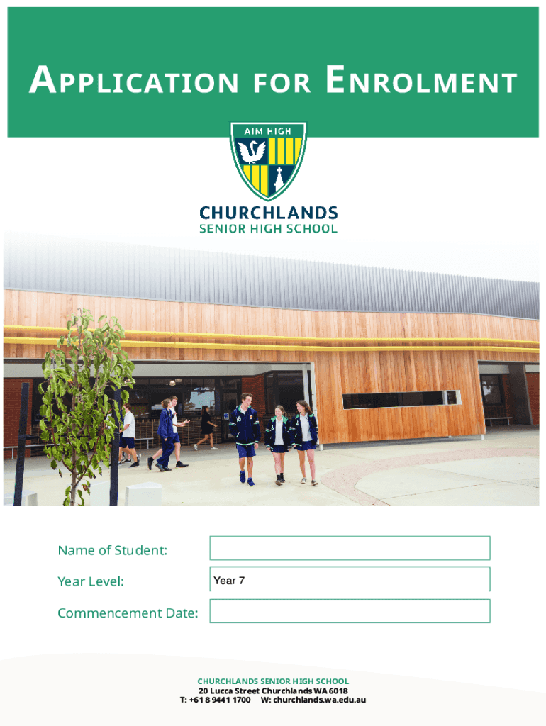 ApplicationforE nrolmentName of Student: Year Level:Year 7Commencement Date:CHURCHYARDS SENIOR HIGH SCHOOL 20 Lucca Street Church lands WA 6018 T: +61 8 9441 1700 W: church lands.Wei.edu.application