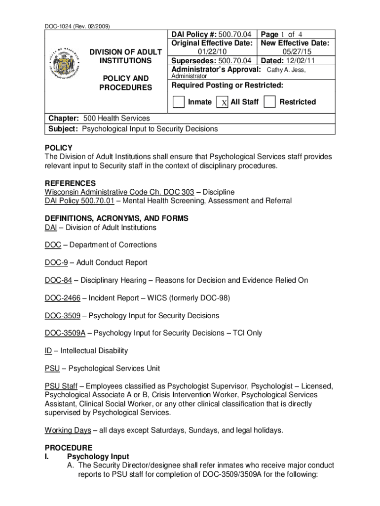 DOC1024 (Rev. 02/2009)DIVISION OF ADULT INSTITUTIONS POLICY AND PROCEDURES DAI Policy #: 500.70.04-Page 1 of 4 Original Effective Date: New Effective Date: 01/22/10 05/27/15 Supersedes: 500.70.04