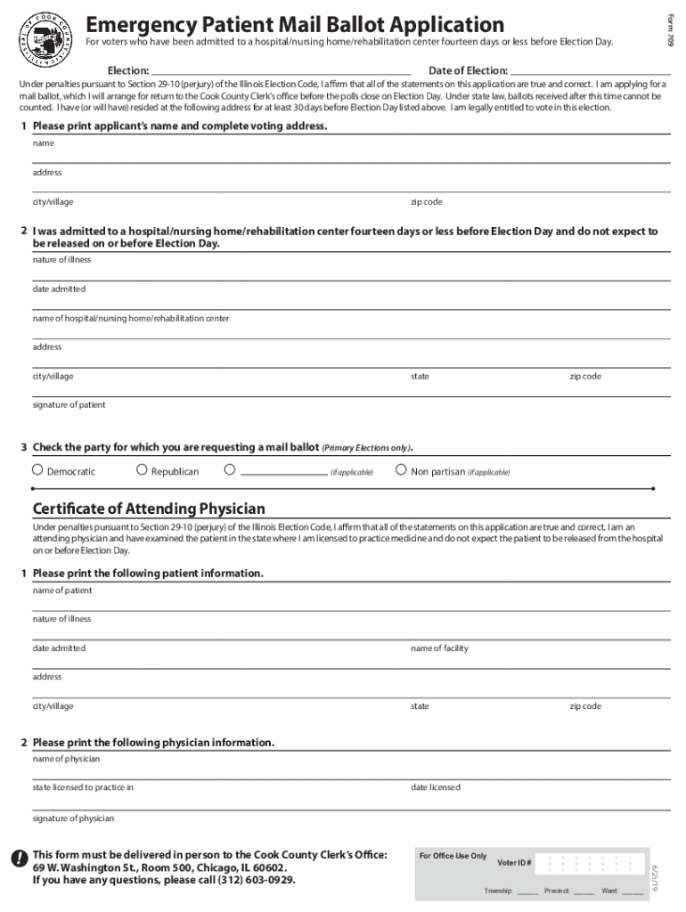 Form 709Emergency Patient Mail Ballot Application voters who have been admitted to a hospital/nursing home/rehabilitation center fourteen days or less before Election Day. Election:Date of Election:Under