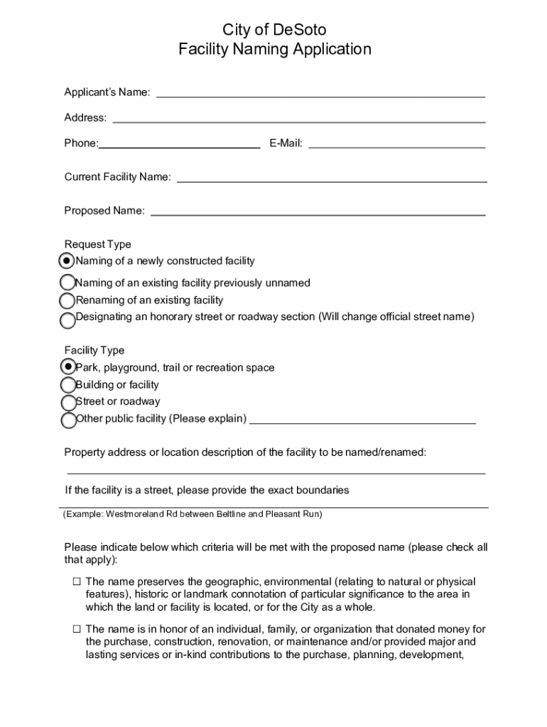 City of DeSoto Facility Naming Application Applicants Name: Address: Phone:Email:Current Facility Name: ___ Proposed Name: Request Type Naming of a newly constructed facility Naming of an existing