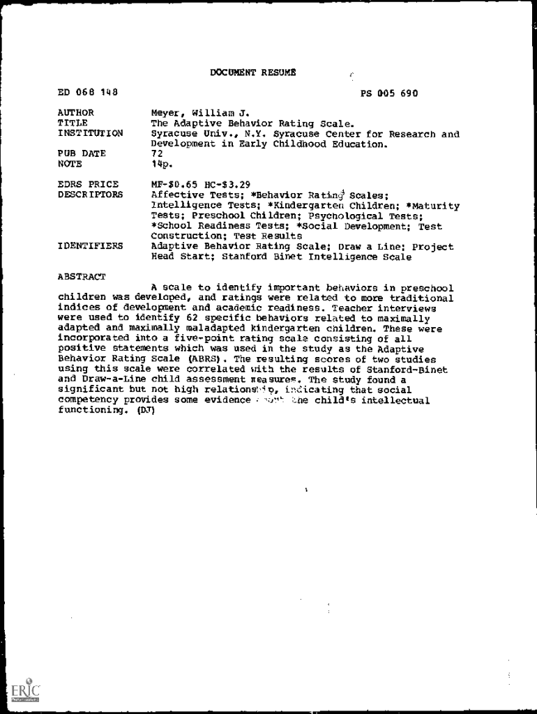 DOCUMENT RESUMED 068 148t\'PS 005 690AUTHOR TITLE INSTITUTION Meyer, William J. The Adaptive Behavior Rating Scale. Syracuse Univ., N.Y. Syracuse Center for Research and Development in Early Childhood