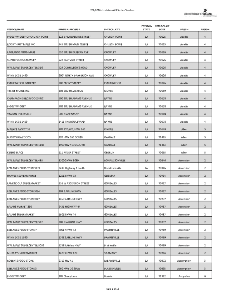 2/2/2016 Louisiana WIC Active VendorsPHYSICAL PATAPHYSICAL ZIP CODEPARISHREGIONCHURCH POINTLA70525Acadia4745 SOUTH MAIN STREETCHURCH POINTLA70525Acadia4LAGRANGE FOOD MART620 SOUTH EASTERN AVECROWLEYLA70526Acadia4SUPER