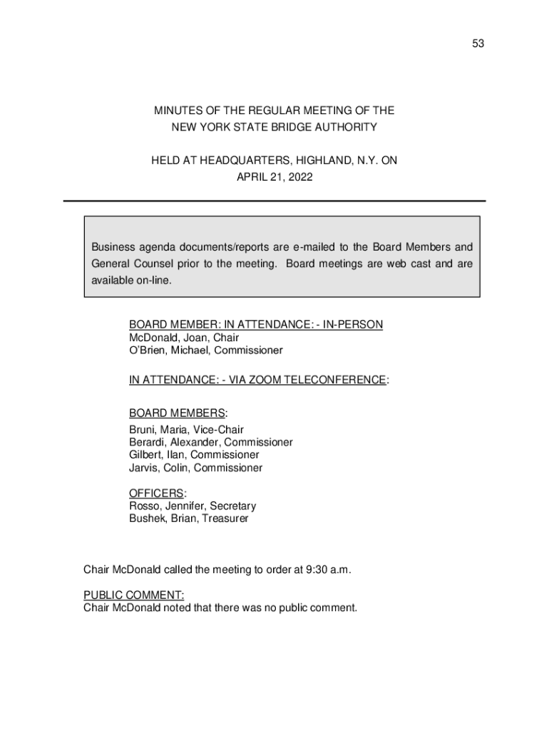 53MINUTES OF THE REGULAR MEETING OF THE NEW YORK STATE BRIDGE AUTHORITY HELD AT HEADQUARTERS, HIGHLAND, N.Y. ON APRIL 21, 2022Business agenda documents/reports are emailed to the Board Members and