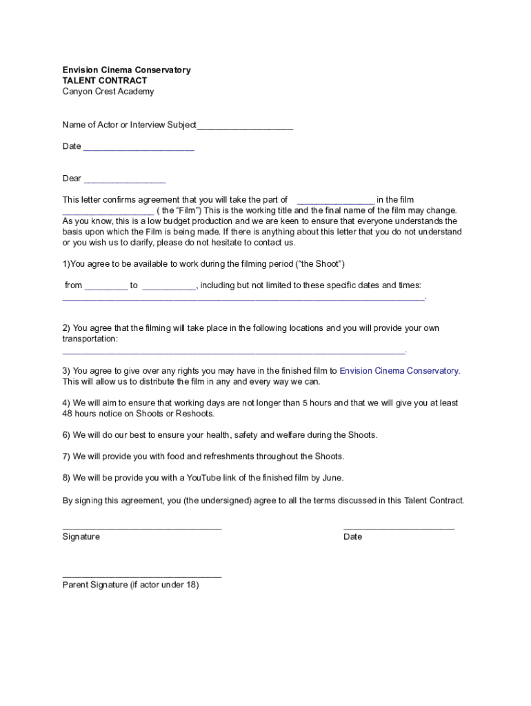 EnvisionCinemaConservatory TALENTCONTRACT CanyonCrestAcademy NameofActororInterviewSubject___ Date___ Dear___ Thisletterconfirmsagreementthatyouwilltakethepartof___inthefilm ___(theism)Thisistheworkingtitleandthefinalnameofthefilmmaychange.