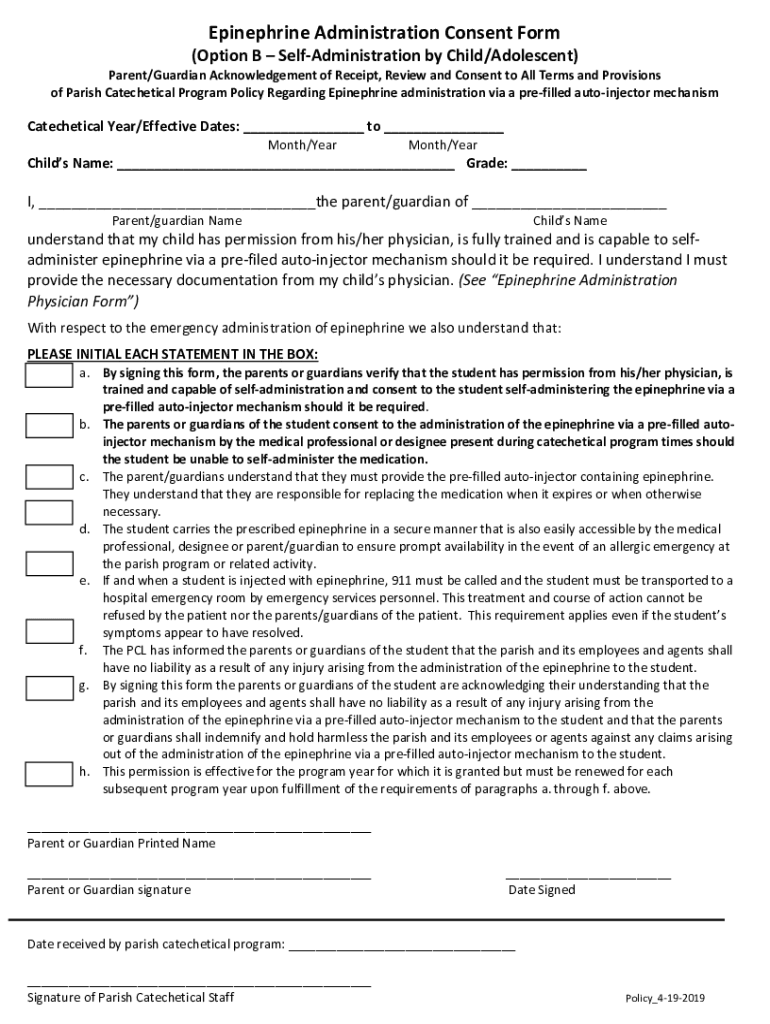 Epinephrine Administration Consent Form (Option B Maladministration by Child/Adolescent) Parent/Guardian Acknowledgement of Receipt, Review and Consent to All Terms and Provisions of Parish Catechetical