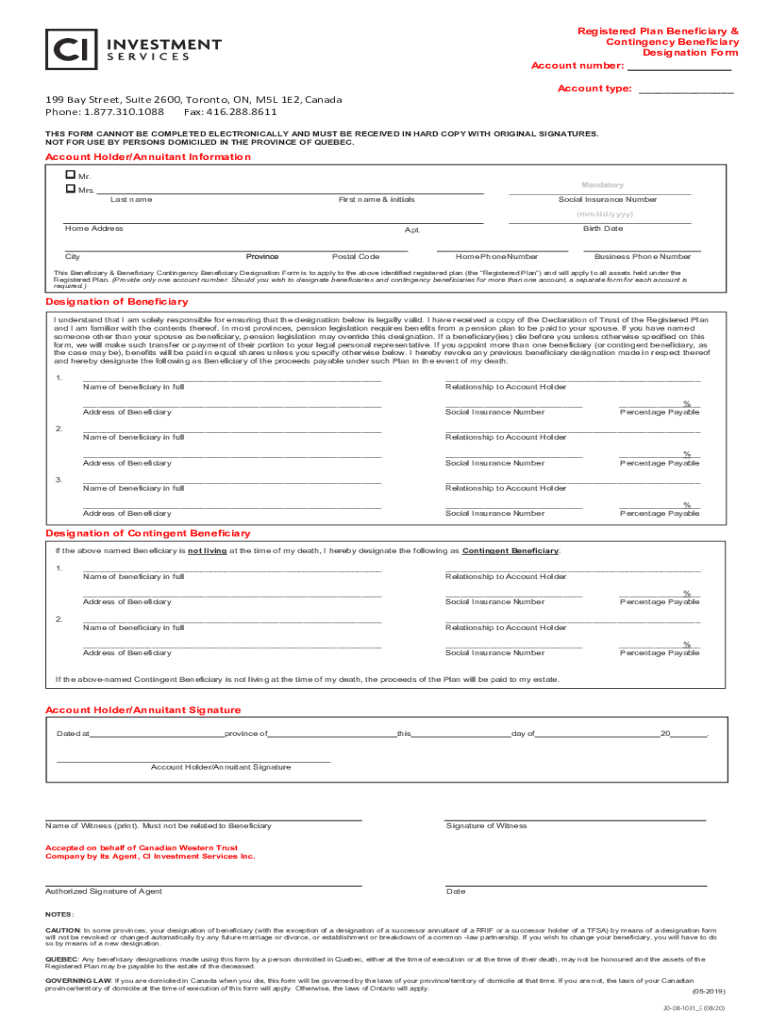 Registered Plan Beneficiary & Contingency Beneficiary Designation Form Account number: Account type: ___199 Bay Street, Suite 2600, Toronto, ON, M5L 1E2, Canada Phone: 1.877.310.1088 Fax: 416.288.8611THIS