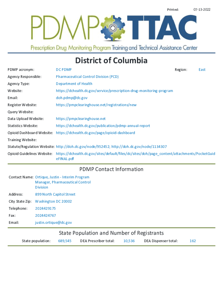 Printed:07132022District of Columbia PUMP acronym:DC PDMPRegion:Agency Responsible:Pharmaceutical Control Division (PCD)Agency Type:Department of HealthWebsite:https://dchealth.dc.gov/service/prescriptiondrugmonitoringprogramEmail:doh.pdmp@dc.govRegister