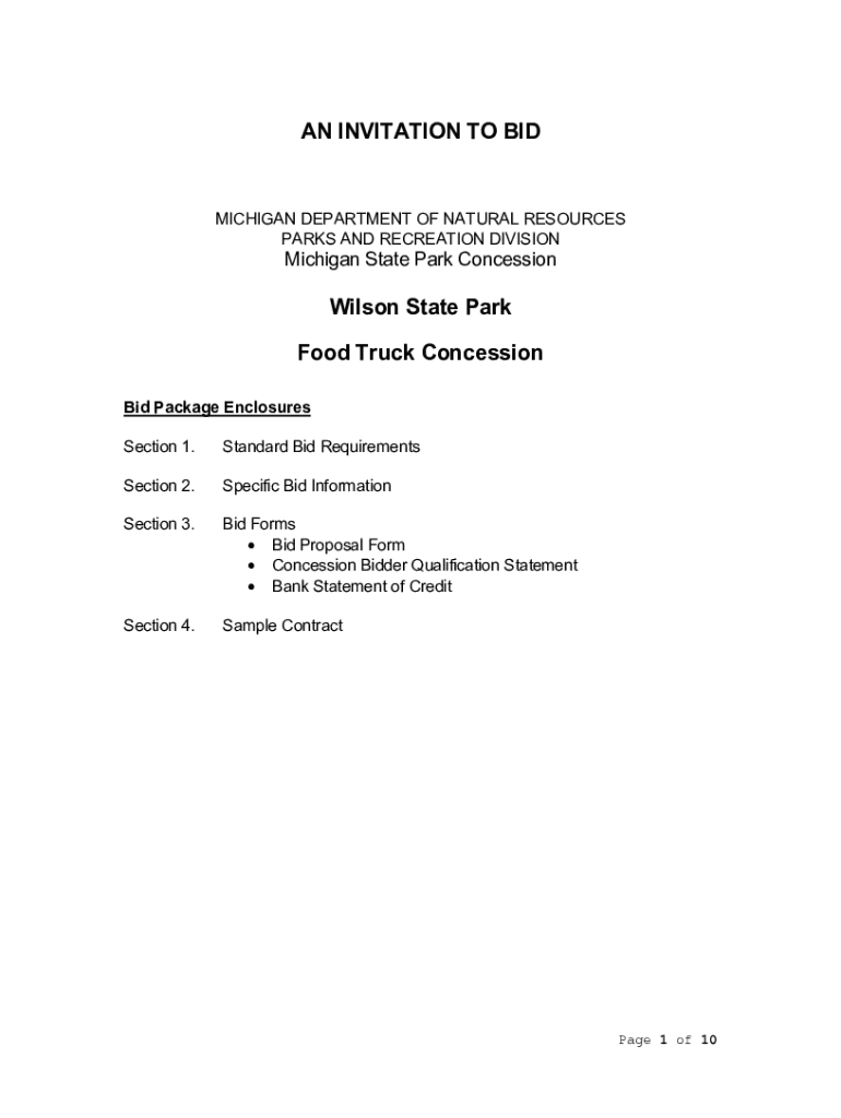 AN INVITATION TO MICHIGAN DEPARTMENT OF NATURAL RESOURCES PARKS AND RECREATION DIVISION Michigan State Park Concession Wilson State Park Food Truck Concession Bid Package Enclosures Section 1. Standard