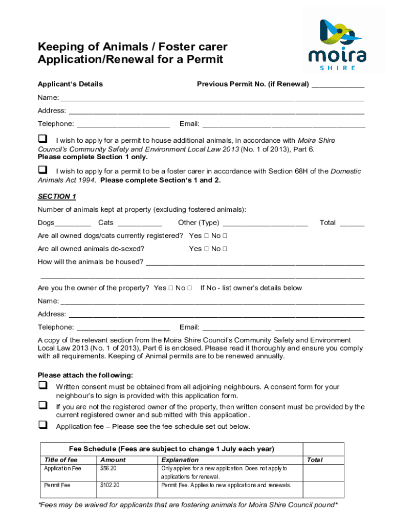Keeping of Animals / Foster carer Application/Renewal for a Permit Applicants DetailsPrevious Permit No. (if Renewal) ___Name: ___ Address: ___ Telephone: ___Email: ___ ___I wish to apply for a permit