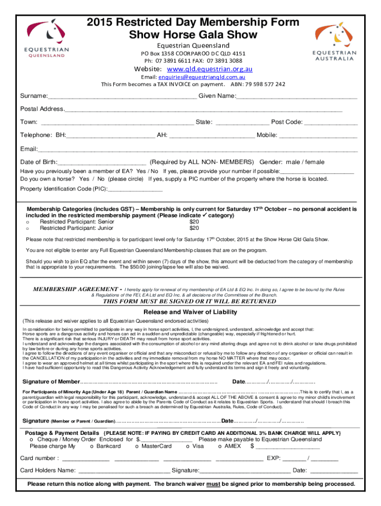 2015 Restricted Day Membership Form Show Horse Gala Show Equestrian Queensland PO Box 1358 COORPAROO DC QLD 4151 pH: 07 3891 6611 FAX: 07 3891 3088Website: www.qld.equestrian.org.au Email: enquiries@equestrianqld.com.au