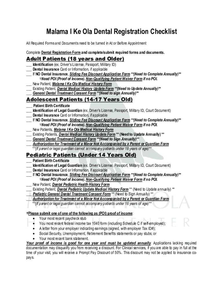 Malaya I KE Ola Dental Registration Checklist All Required Forms and Documents need to be turned in At or Before Appointment Complete Dental Registration Form and complete/submit required forms and