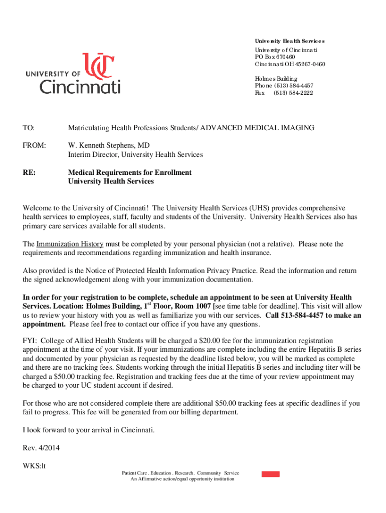 University Health Services University of Cincinnati PO Box 670460 Cincinnati OH 452670460 Holmes Building Phone (513) 5844457 Fax (513) 5842222TO:Matriculating Health Professions Students/ ADVANCED