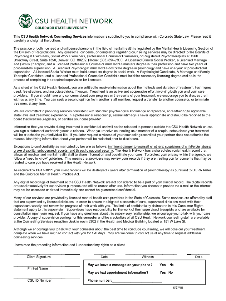 This CSU Health Network Counseling Services information is supplied to you in compliance with Colorado State Law. Please read it carefully and sign at the bottom. The practice of both licensed and