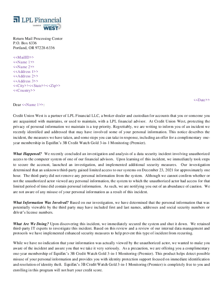 Return Mail Processing Center P.O. Box 6336 Portland, OR 972286336 Mailed Name 1 Name 2 Address 1 Address 2 Address 3 CityStateZip Country Date Dear Name 1: Credit Union West is a partner of LPL Financial
