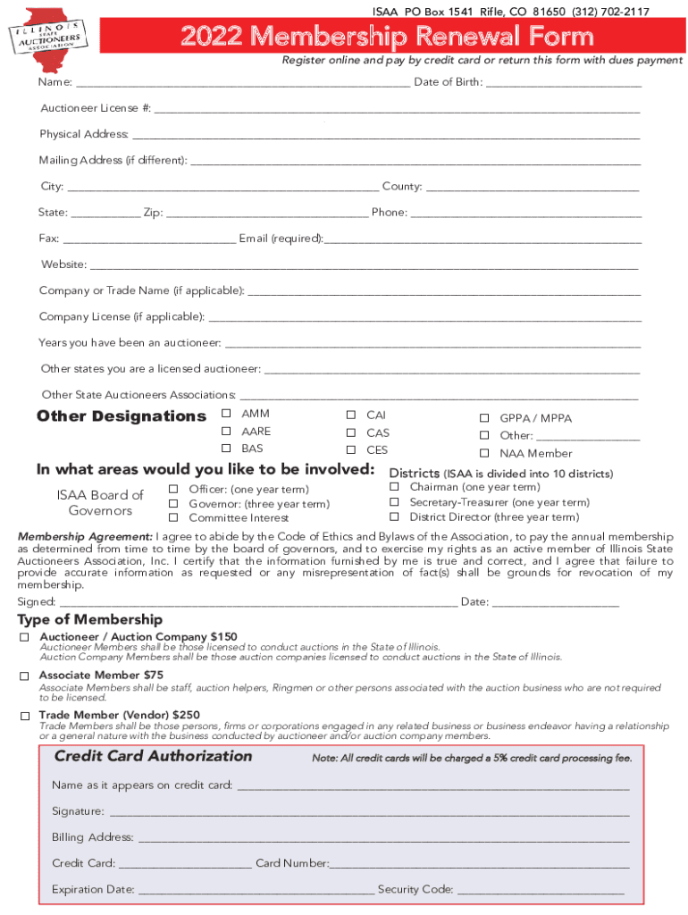 ISAAC PO Box 1541 Rifle, CO 81650 (312) 70221172022 Membership Renewal Preregister online and pay by credit card or return this form with dues paymentName: ___ Date of Birth: ___ Auctioneer License