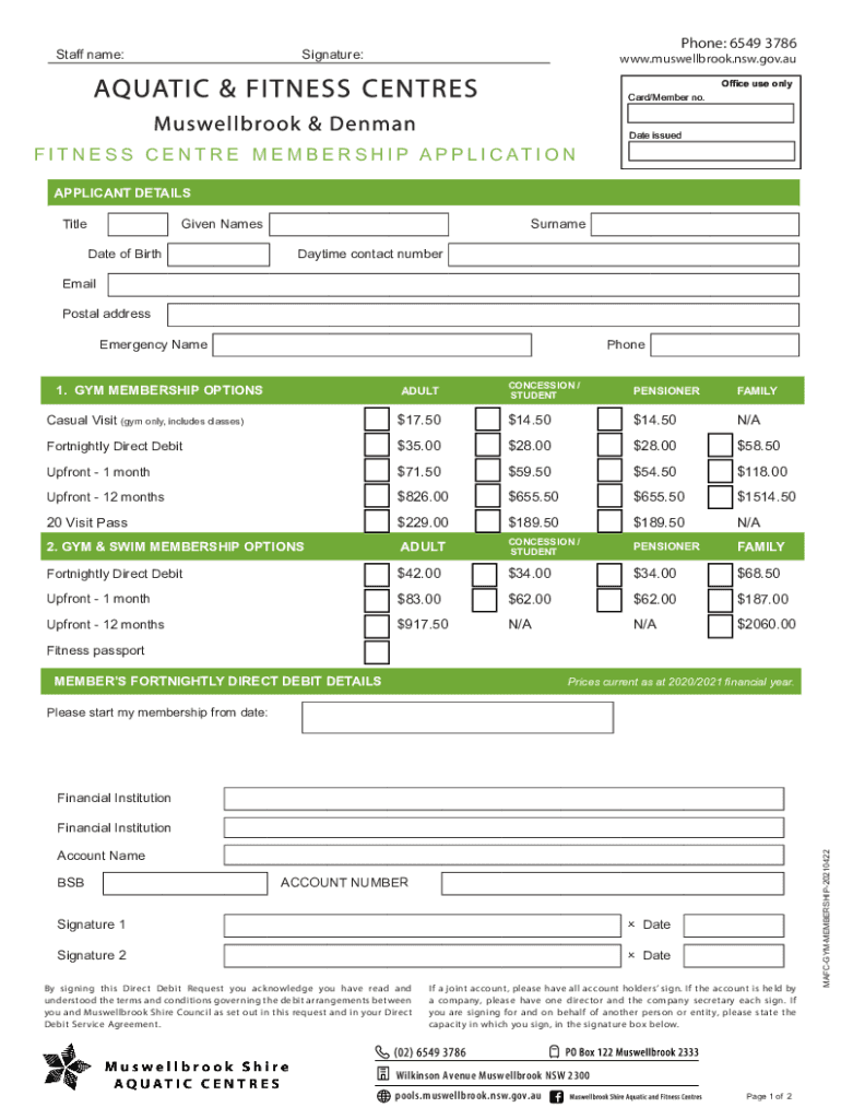 Staff name:Phone: 6549 3786Signature:www.muswellbrook.nsw.gov.au Office use only Card/Member no. Date issued I T N E S S C E N T R E M E M B E R S H I P A P P L I C AT I O N APPLICANT DETAILS TitleGiven