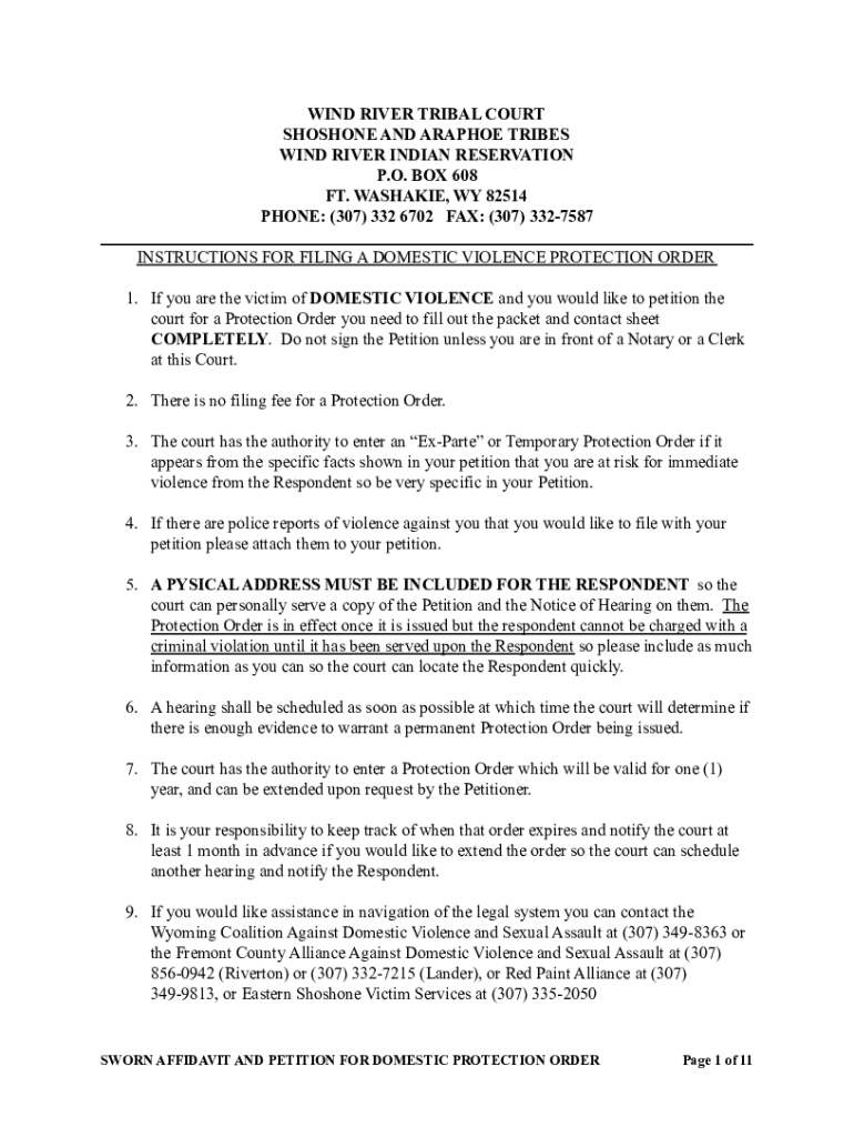 WIND RIVER TRIBAL COURT SHOSHONE AND ARAPAHOE TRIBES WIND RIVER INDIAN RESERVATION P.O. BOX 608 FT. WASHABLE, WY 82514 PHONE: (307) 332 6702 Faxes: (307) 3327587 INSTRUCTIONS FOR FILING A DOMESTIC