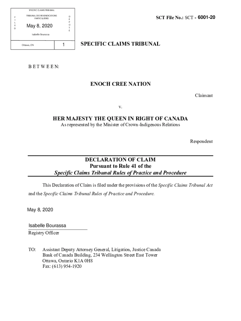 SPECIFIC CLAIMS TRIBUNAL F I L E DTRIBUNAL DES REDEDICATIONS PARTICULIRESSCT File No.: SET 600120 D P O S May 8, 2020, Isabelle Bourassa1Ottawa, NONSPECIFIC CLAIMS TRIBUNAL E T W E E N:ENOCH CREE