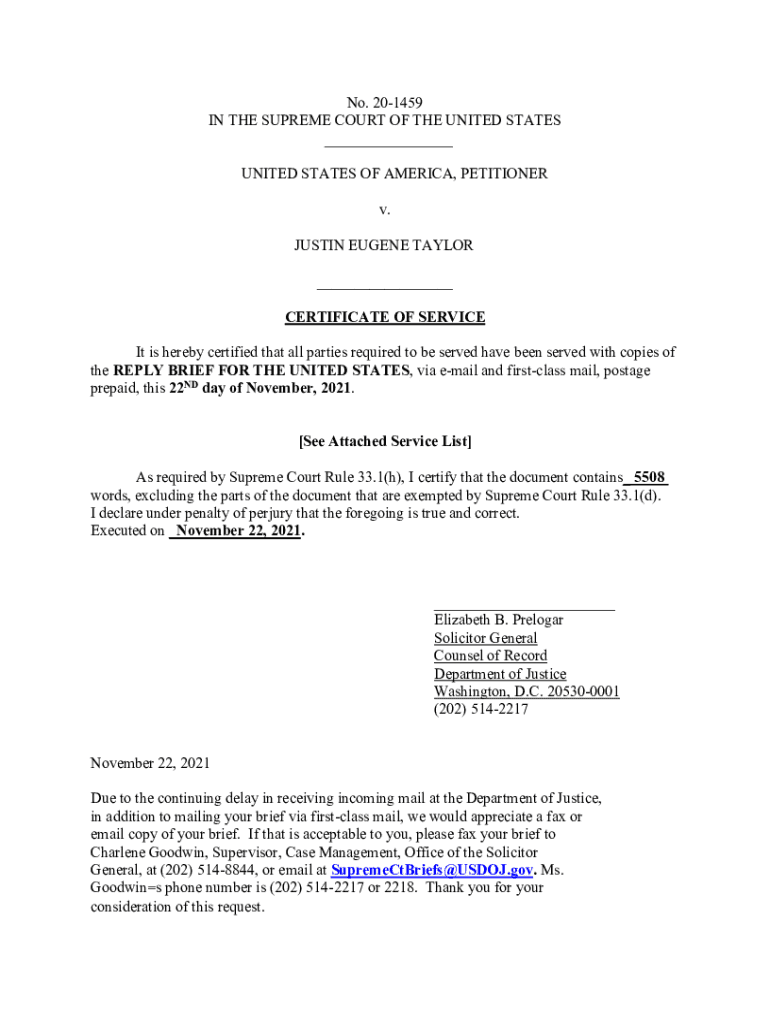 No. 201459 IN THE SUPREME COURT OF THE UNITED STATES ___ UNITED STATES OF AMERICA, PETITIONER v. JUSTIN EUGENE TAYLOR ___ CERTIFICATE OF SERVICE It is hereby certified that all parties required to