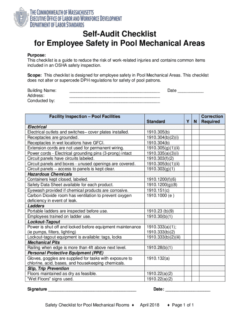 Plaudit Checklist for Employee Safety in Pool Mechanical Areas Purpose: This checklist is a guide to reduce the risk of work related injuries and contains common items included in an OSHA safety inspection.