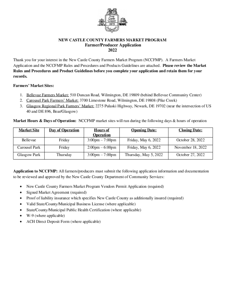 Get the free newcastlede.govFarmers-Markets-Application-PDFNEW CASTLE COUNTY FARMERS MARKET PROGR...