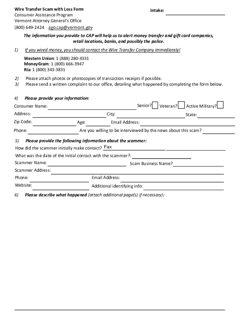 Wire Transfer Scam with Loss Form Consumer Assistance Program Vermont Attorney General\'s Office (800) 6492424 ago.cap@vermont.govIntake:The information you provide to CAP will help us to alert money