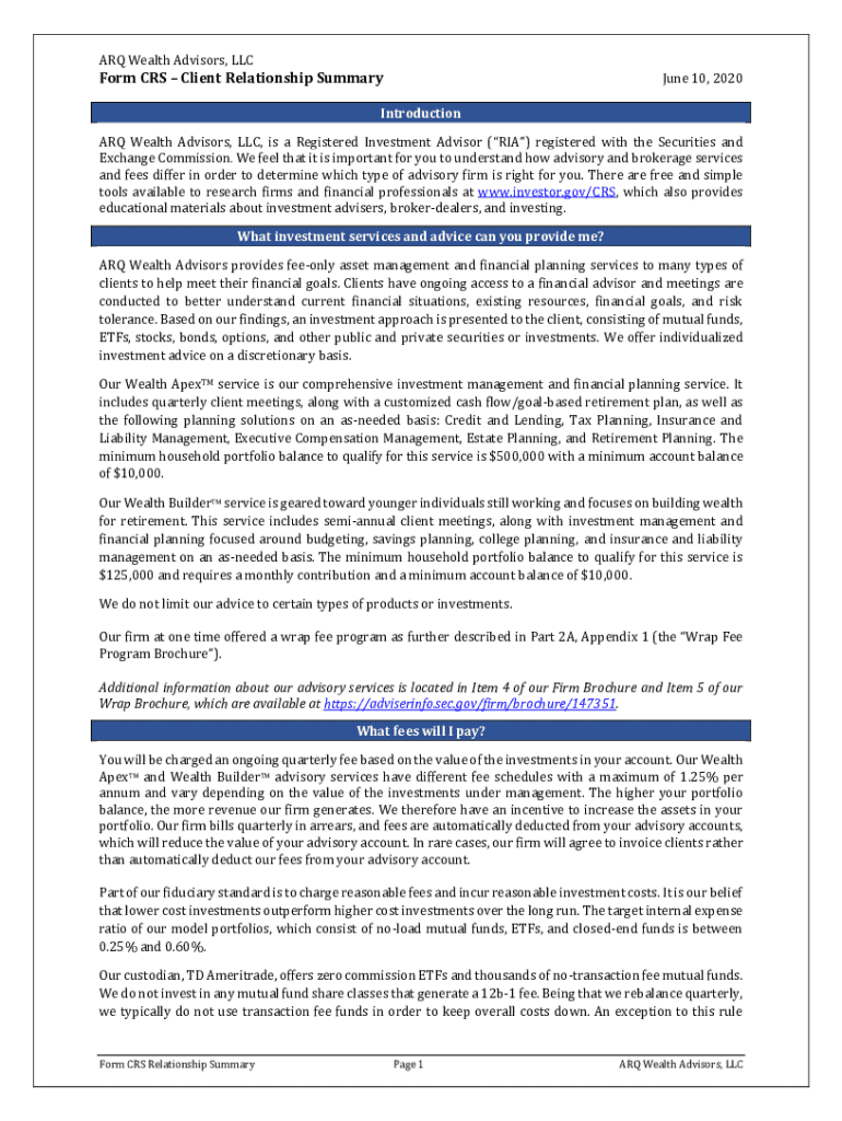 ARQ Wealth Advisors, Form CRS Client Relationship Summary June 10, 2020Introduction ARQ Wealth Advisors, LLC, is a Registered Investment Advisor (RIA) registered with the Securities and Exchange Commission.