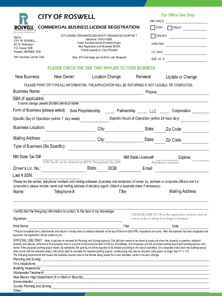 For Office Use Velocity OF ROSWELL. PAID COMMERCIAL BUSINESS LICENSE REGISTRATION Community Developmentally ZONING ORDINANCES #2008/CITY ORDINANCES CHAPTER 7 Telephone 5756376280 Email: Business.license@roswellnm.gov
