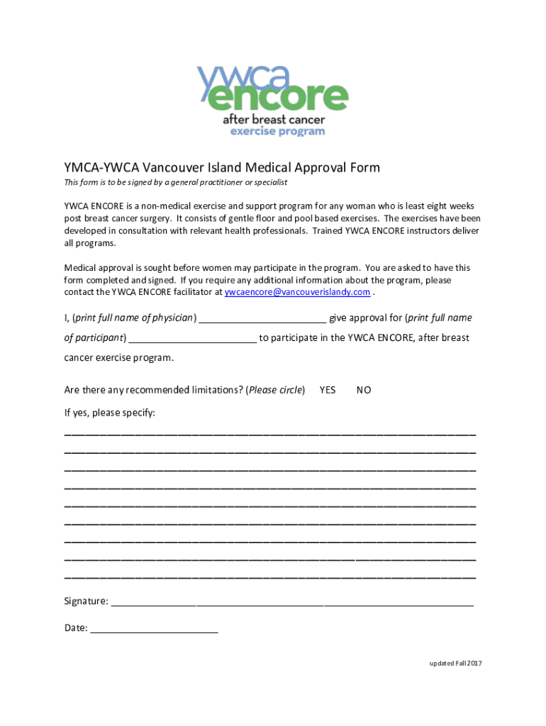 YMCA YWCA Vancouver Island Medical Approval Form This form is to be signed by a general practitioner or specialist YWCA ENCORE is a nonmedical exercise and support program for any woman who is least