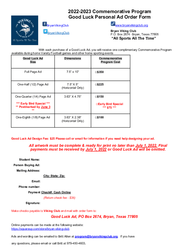20222023 Commemorative Program Good Luck Personal Ad Order Form www.bryanvikingclub.orgBryanVikingClubBryan Viking Club P.O. Box 2674 Bryan, Texas 77805BryanVikingClubAll Sports All The Timewise each