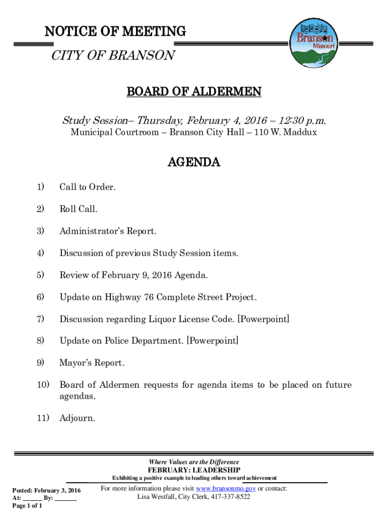 NOTICE OF PERTINACITY OF BRANSON BOARD OF ALDERMEN Study Session Thursday, February 4, 2016 12:30 p.m. Municipal Courtroom Branson City Hall 110 W. MadduxAGENDA 1)Call to Order.2)Roll Call.3)Administrators