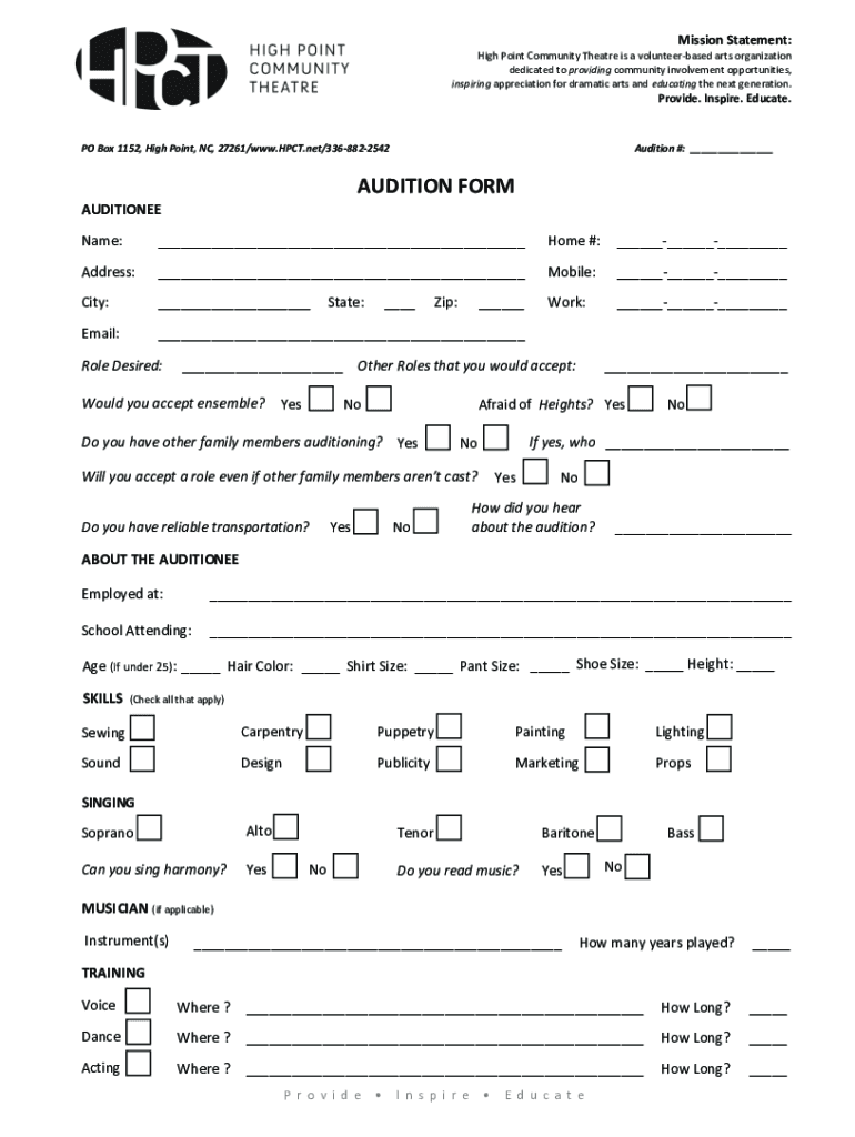 Mission Statement:High Point Community Theater is a volunteer based arts organization dedicated to providing community involvement opportunities, inspiring appreciation for dramatic arts and educating
