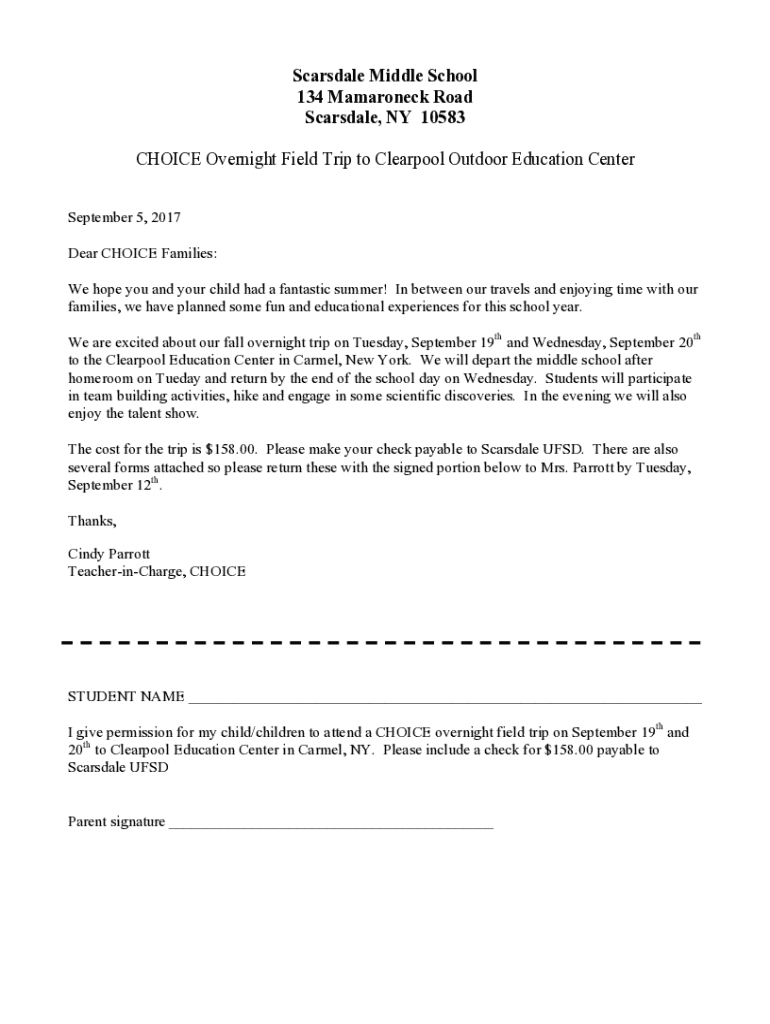 Scarsdale Middle School 134 Mamaroneck Road Scarsdale, NY 10583 CHOICE Overnight Field Trip to Clear pool Outdoor Education Center September 5, 2017, Dear CHOICE Families: We hope you and your child